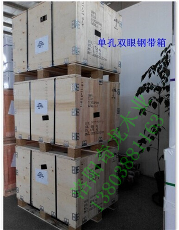 鋼帶木箱,別稱鋼帶包邊木箱、鋼邊箱、鍍鋅鋼帶木箱。用膠合板(一般厚度在7mm、9mm、12mm、15mm、18mm)及鋼帶壓合而成的木箱,可拆卸,方便運(yùn)輸。